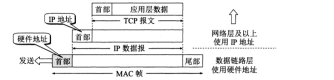 在发送数据时,数据从高层下到低层,然后才到通信链路上传输。使用IP 地址的IP 数据报一旦交给了数据链路层,就被封装成MAC 帧了。MAC 帧在传送时使用的源地址和目的地址都是硬件地址,这两个硬件地址都写在MAC 帧的首部中。