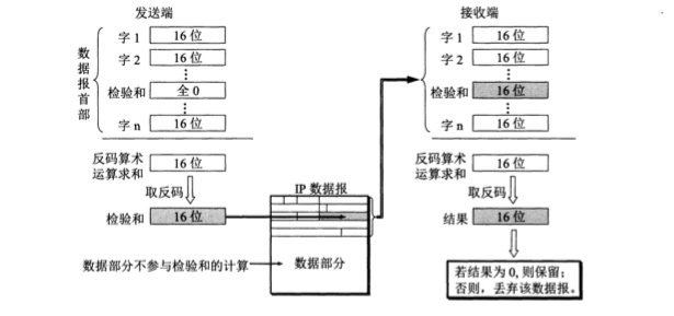 在发送方,先把IP数据报首部划分为许多16位字的序列,并把检验和字段置零。用反码算术运算把所有16位字相加后,将得到的和的反码写入检验和字段。接收方收到数据报后,将首部的所有16 位字再使用反码算术运算相加一次。将得到的和取反码,即得出接收方检验和的计算结果。若首部未发生任何变化,则此结果必为0,于是就保留这个数据报。否则即认为出差错,并将此数据报丢弃。