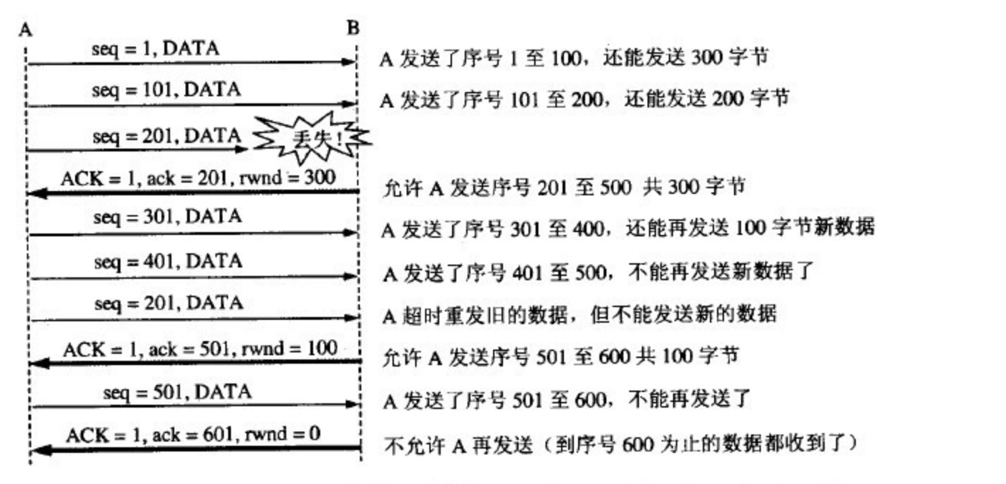 从图中可以看出,B进行了三次流量控制。第一次把窗口减少到 rwnd = 300 ,第二次又减到了 rwnd = 100 ,最后减到 rwnd = 0 ,即不允许发送方再发送数据了。这种使发送方暂停发送的状态将持续到主机B重新发出一个新的窗口值为止。B向A发送的三个报文段都设置了 ACK = 1 ,只有在ACK=1时确认号字段才有意义。